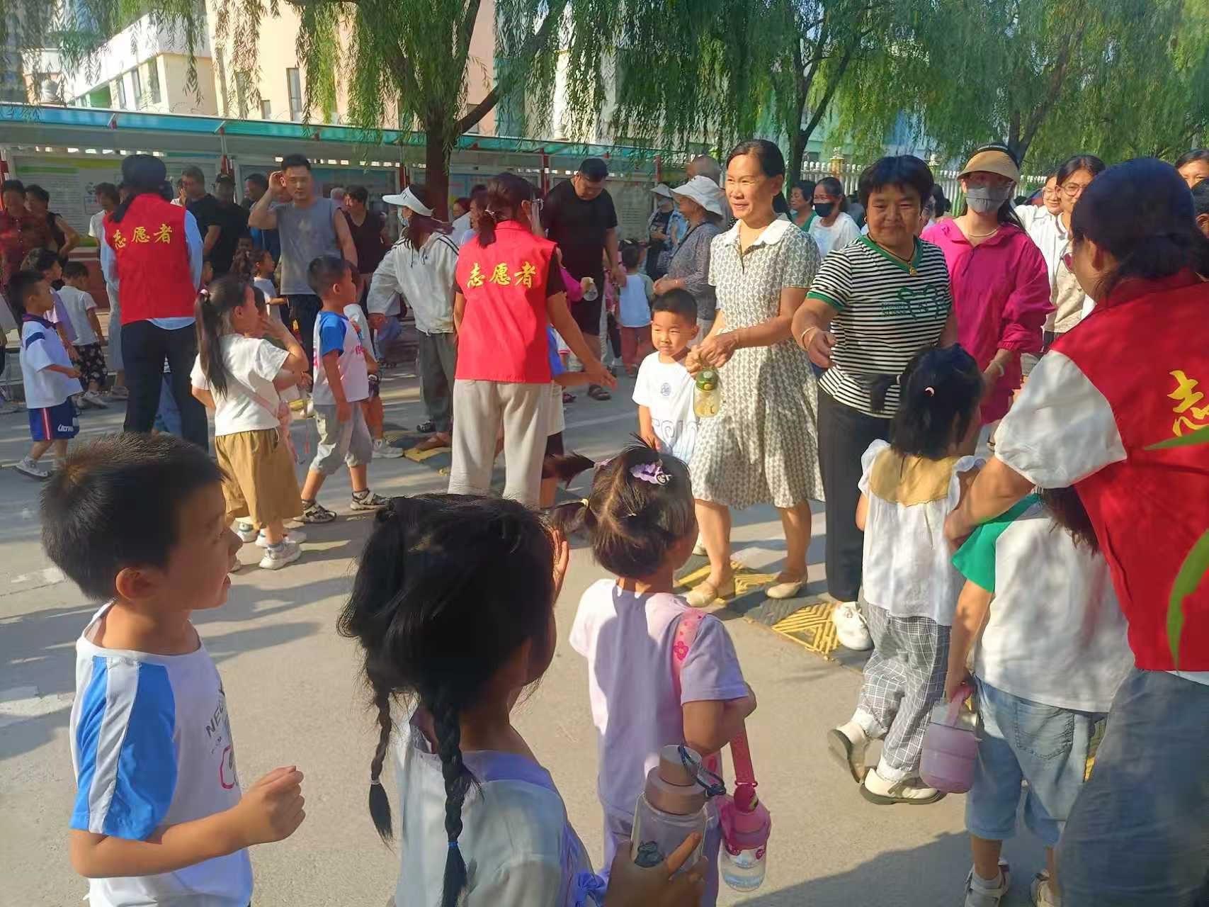 志愿者教师提前到岗,劝阻园门口无关人员、流动摆摊商贩,营造安全的周边环境;放学后有序引导幼儿找到家长,确认接送人身份,避免误接。
