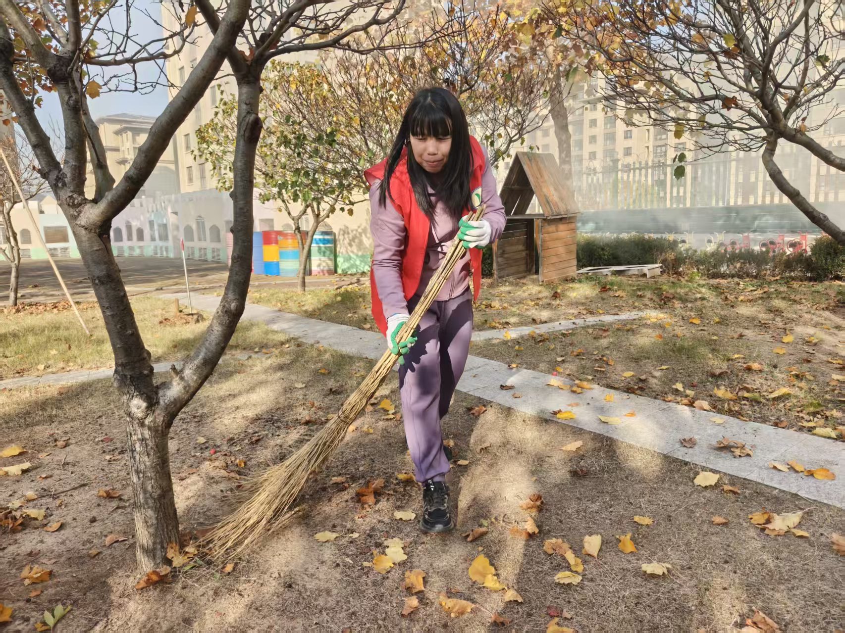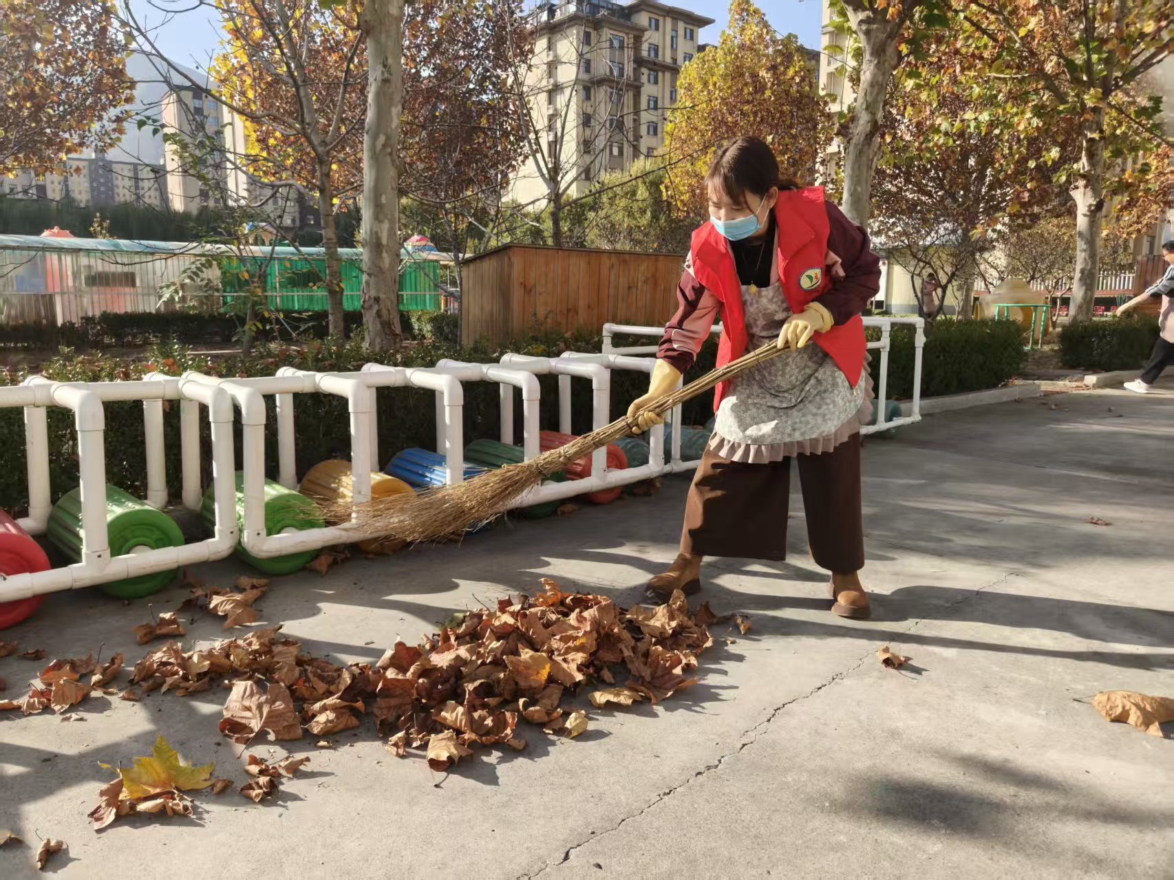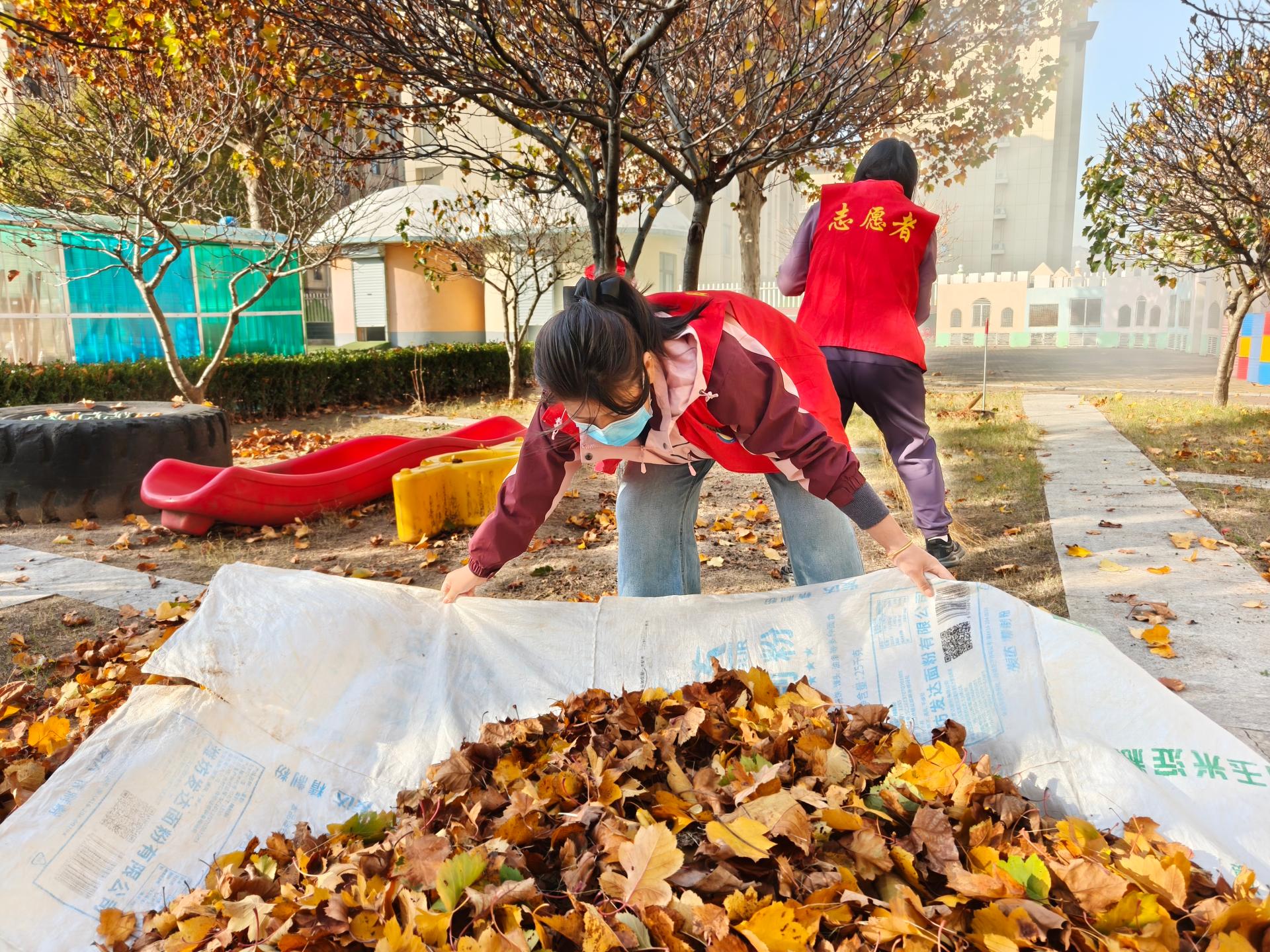 志愿者教师提前准备扫帚、簸箕、垃圾袋等卫生清理工具,按照区域分工,依次对户外塑胶地面、悬浮地板、种植区域内的落叶进行清理,营造干净整洁的园所环境。