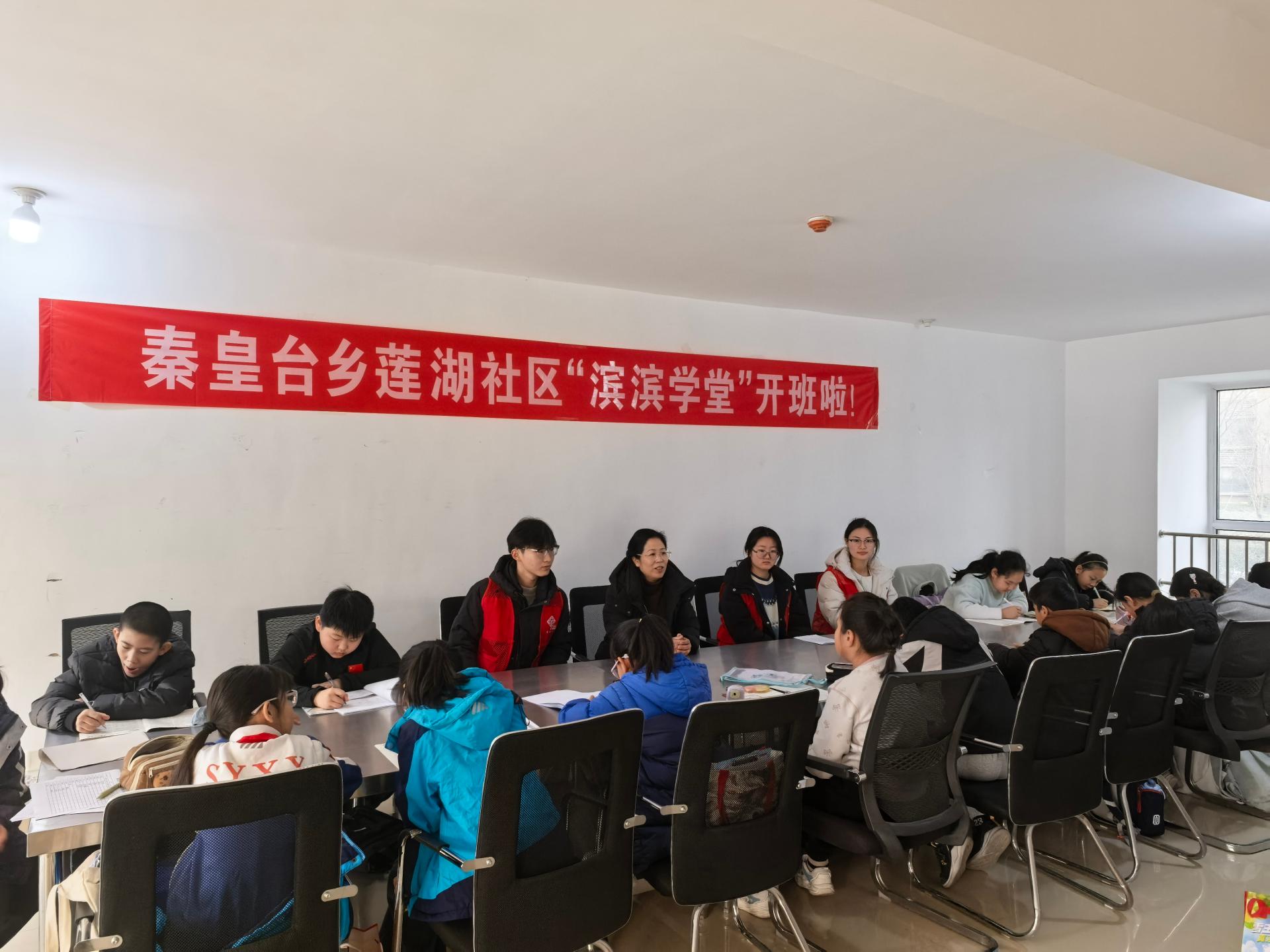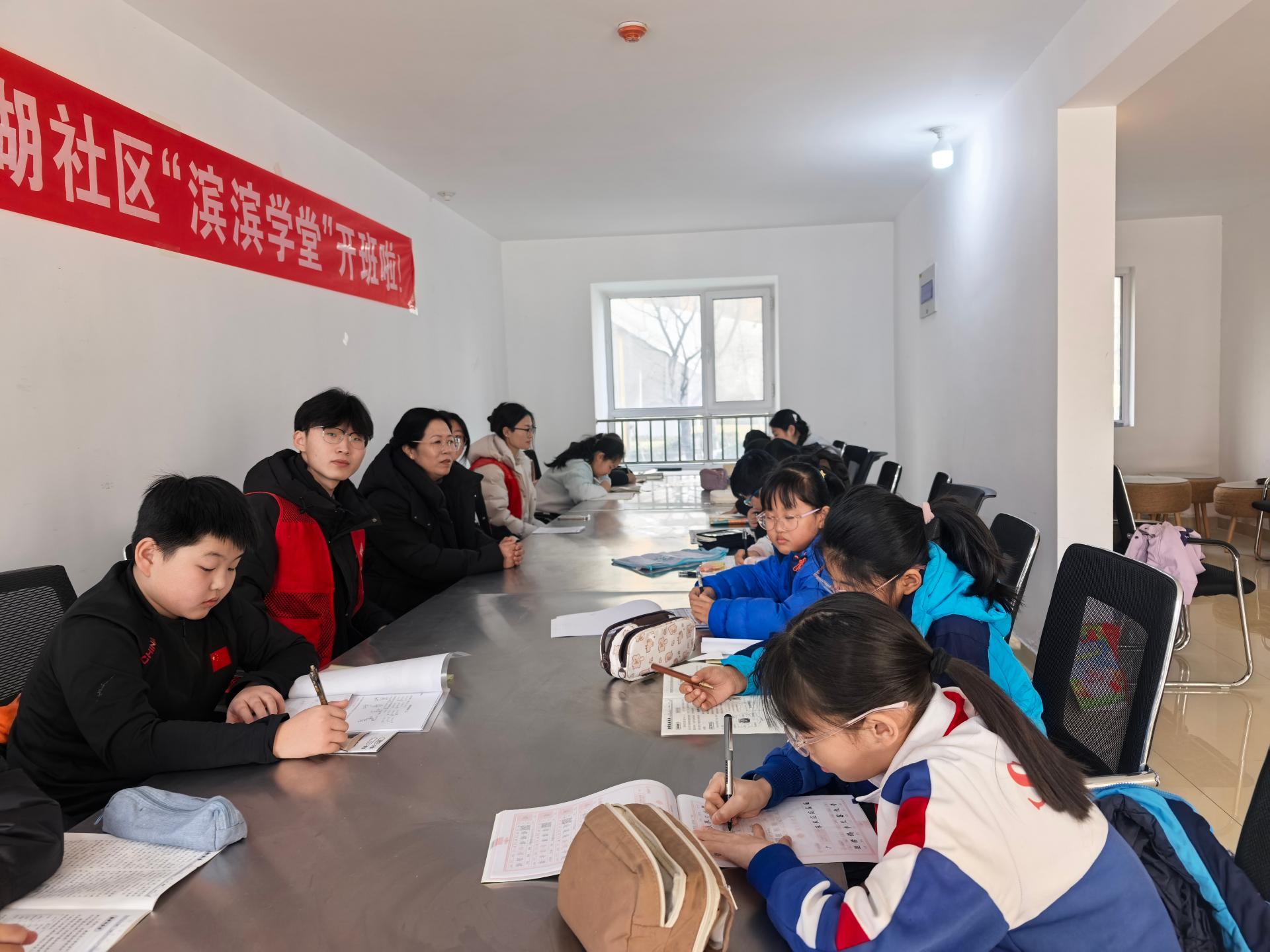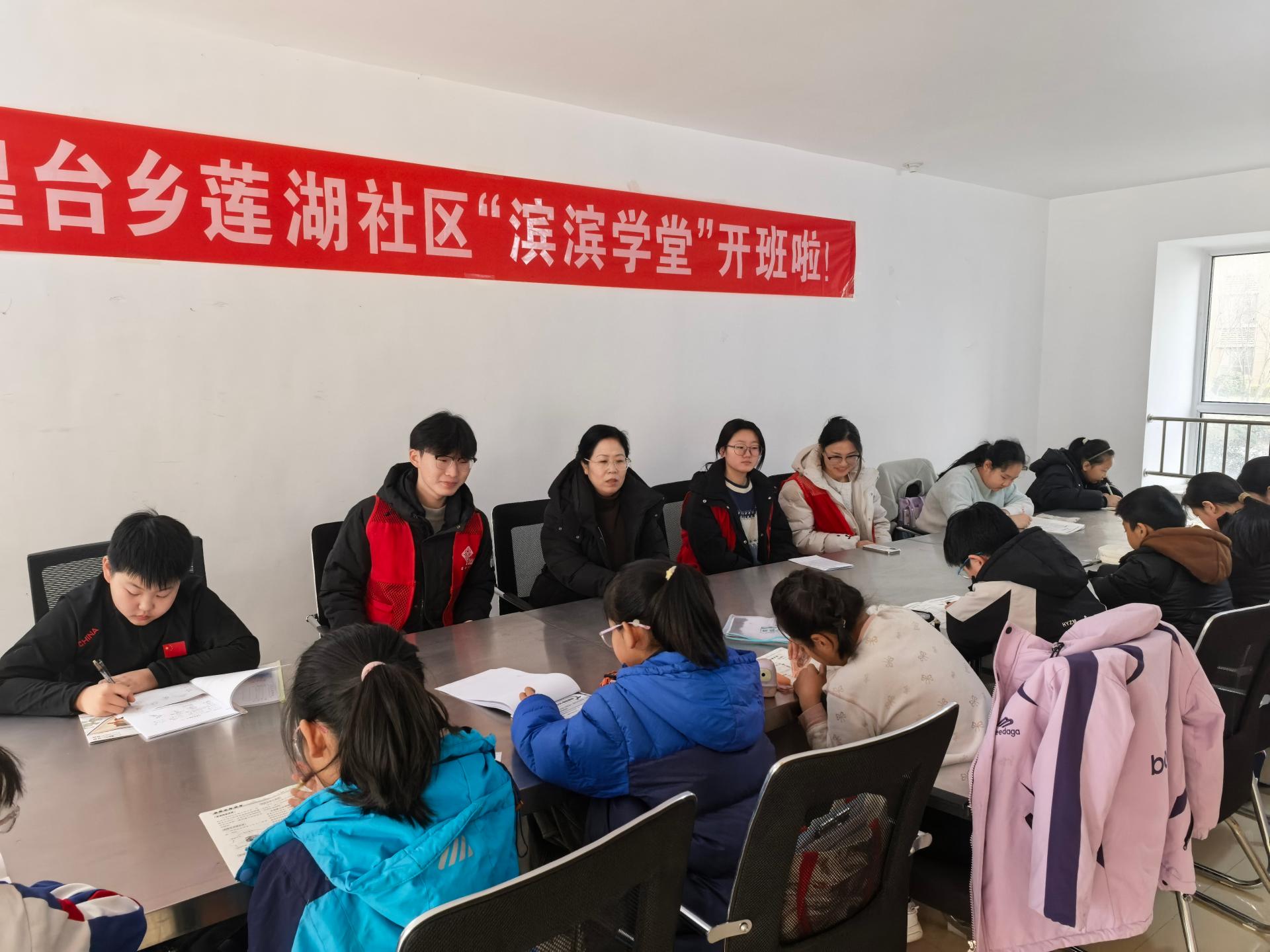 莲湖社区"滨滨学堂"大学生志愿者,免费为辖区学生提供寒假公益托管服务,助力学生攻克假期作业难题,提升学习效率。