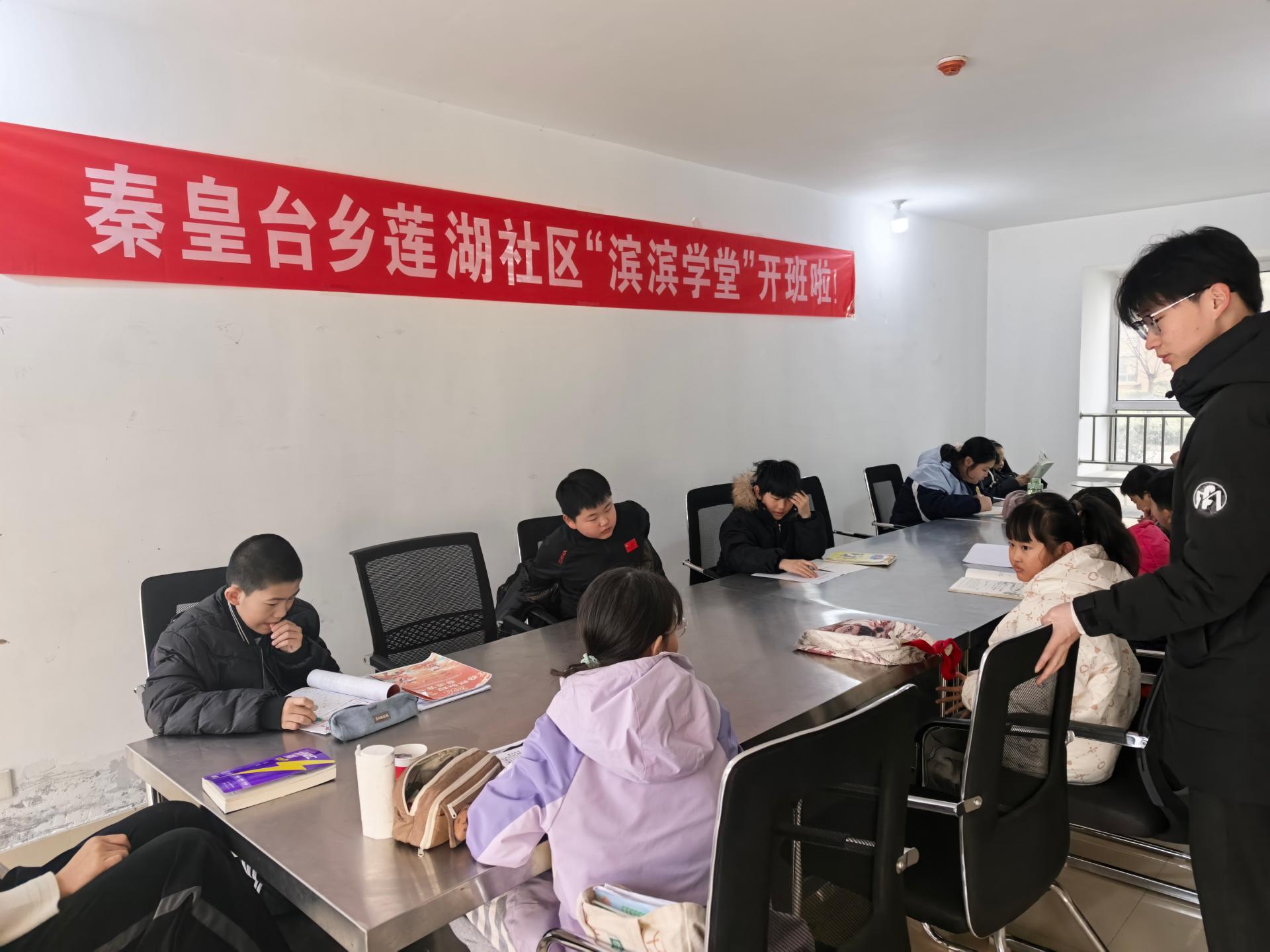莲湖社区"滨滨学堂"大学生志愿者,免费为辖区学生提供寒假公益托管服务,助力学生攻克假期作业难题,提升学习效率。