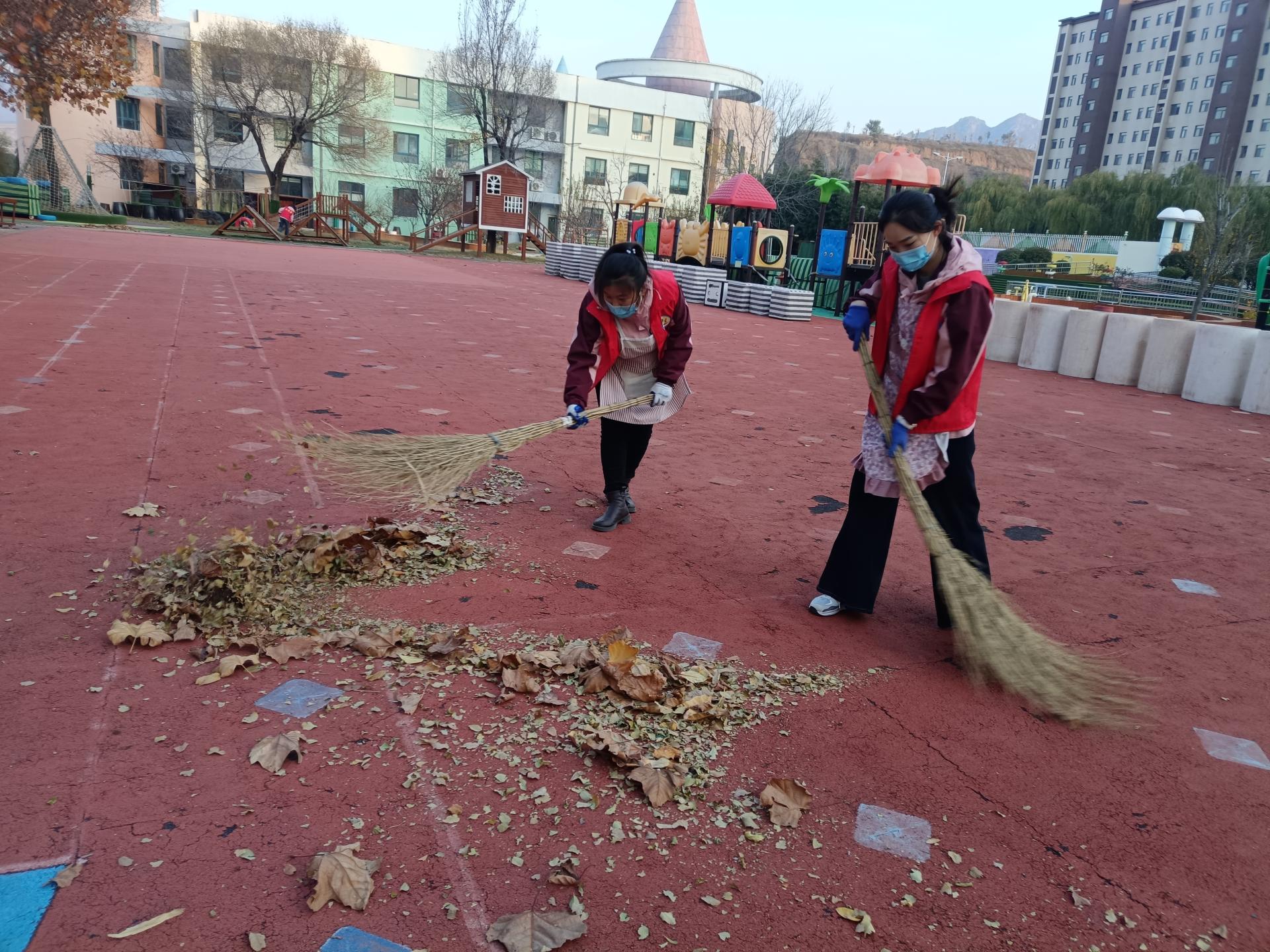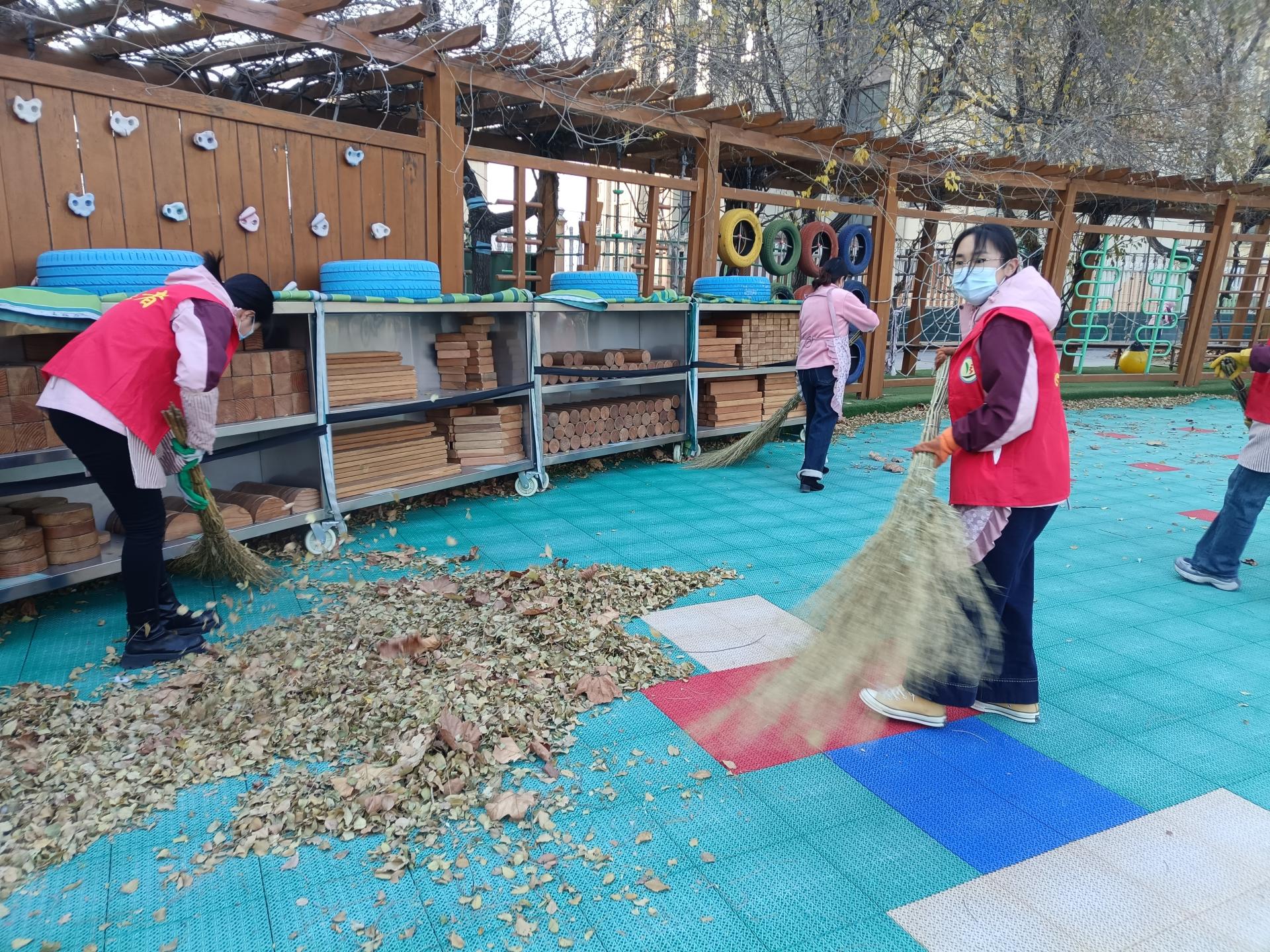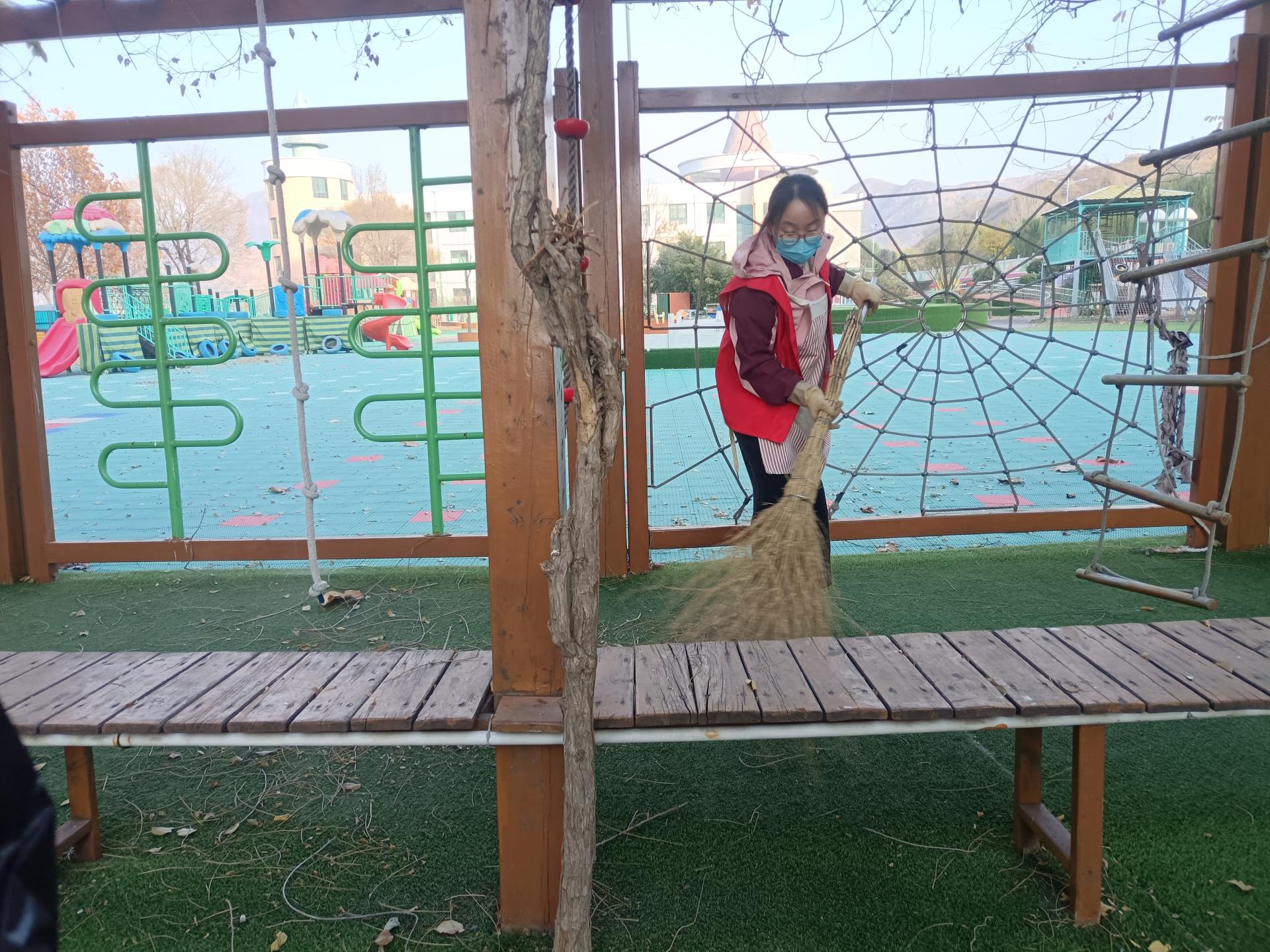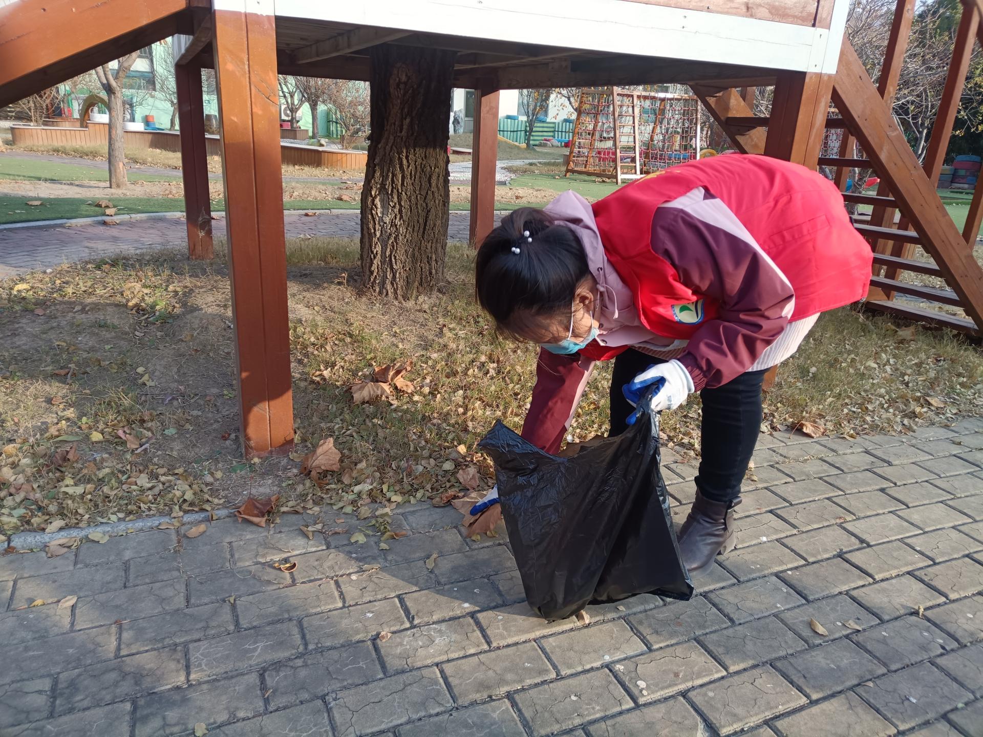 志愿者教师提前准备手套、垃圾袋、抹布等清洁工具,根据分工依次对幼儿园户外各区域进行一次卫生大清理活动。
