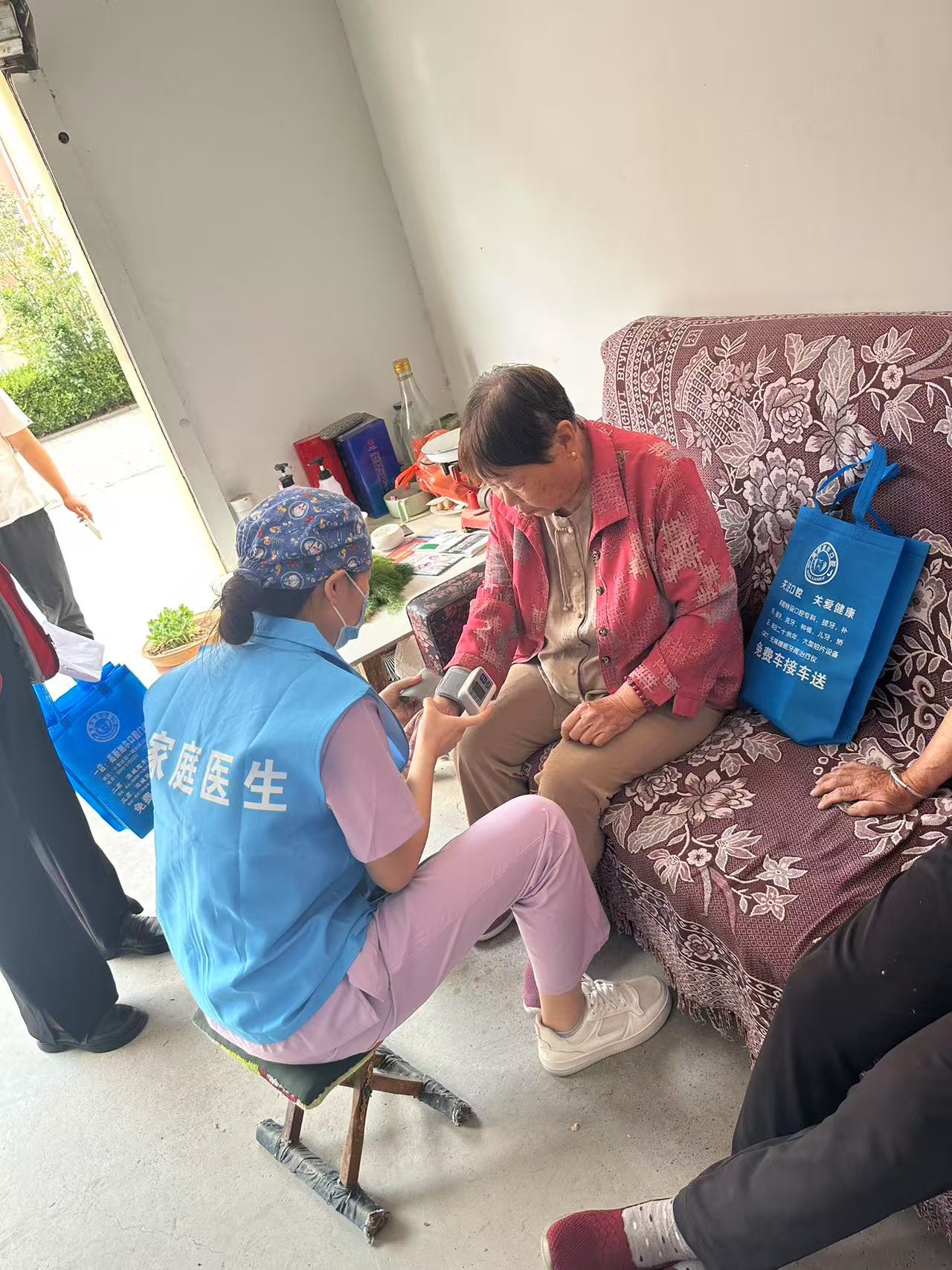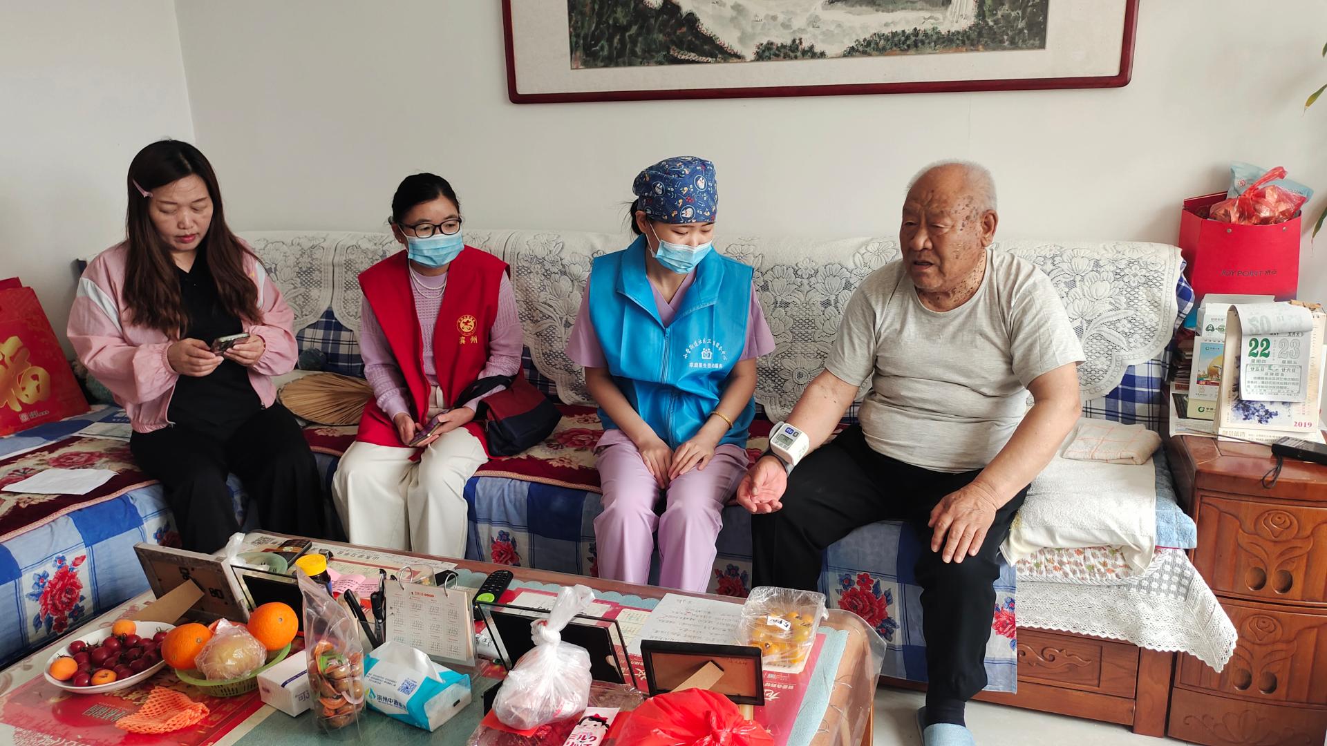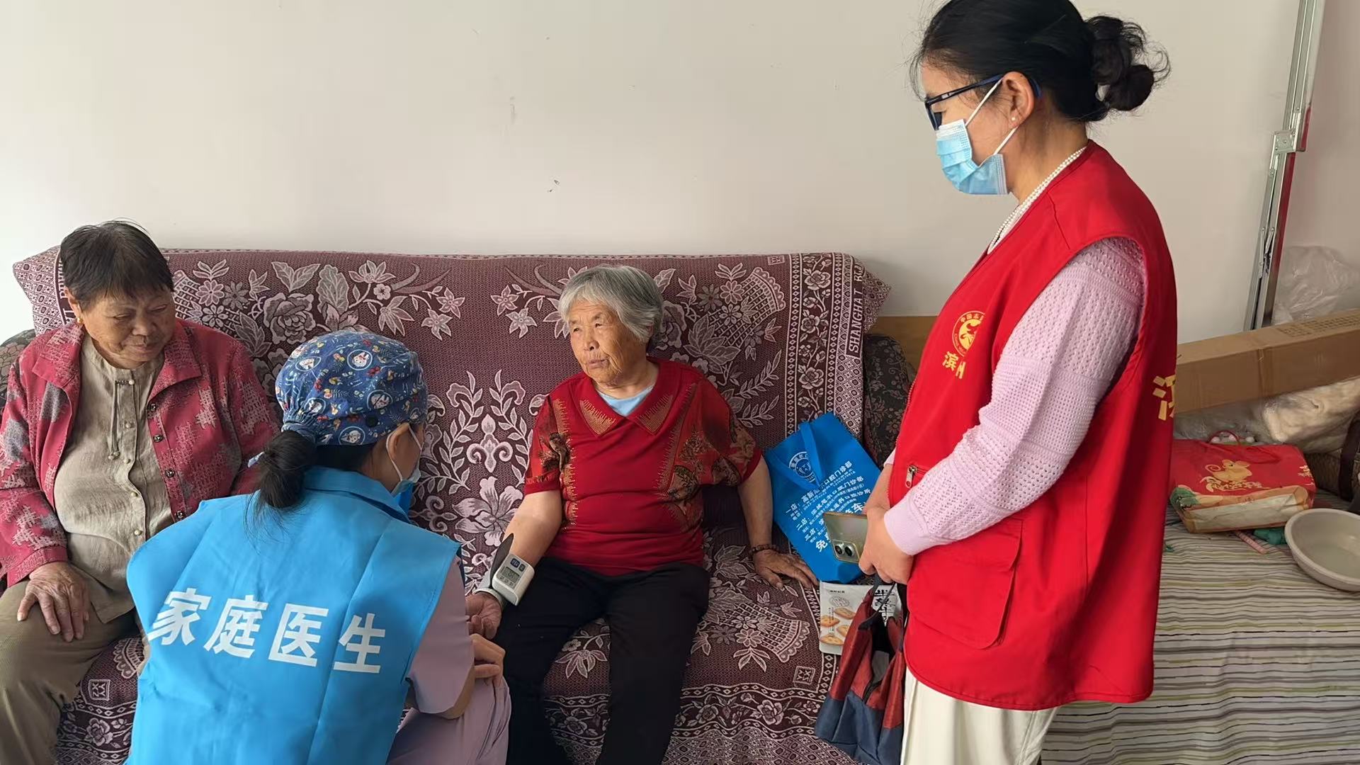 穿家庭医生蓝马甲,跟随龙城社区干部下社区,小区,入户为独居老年人测量血压、健康指导,发放健康教育手册与卫生用品。