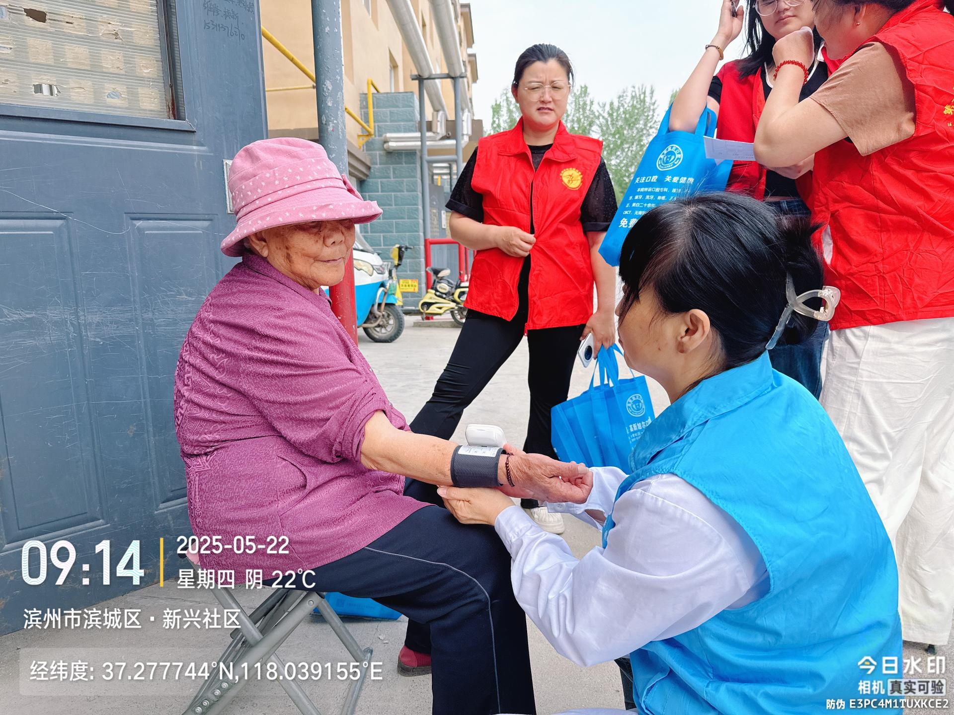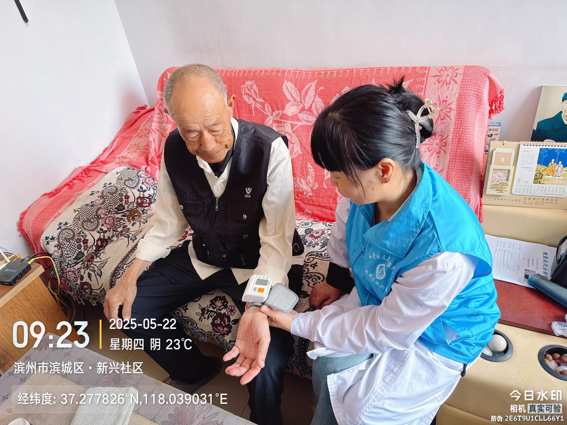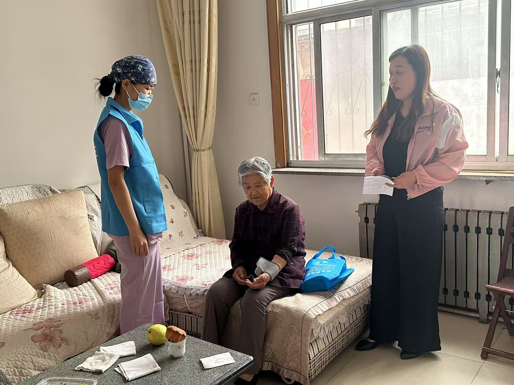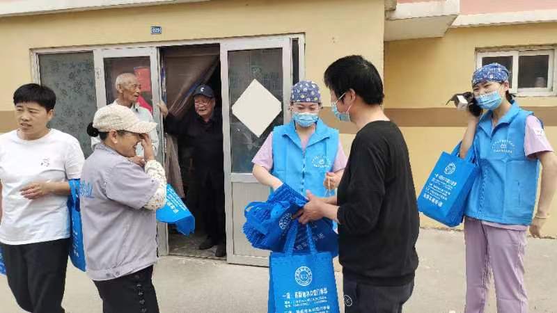 穿家庭医生蓝马甲,跟随龙城社区干部下社区,小区,入户为独居老年人测量血压、健康指导,发放健康教育手册与卫生用品。